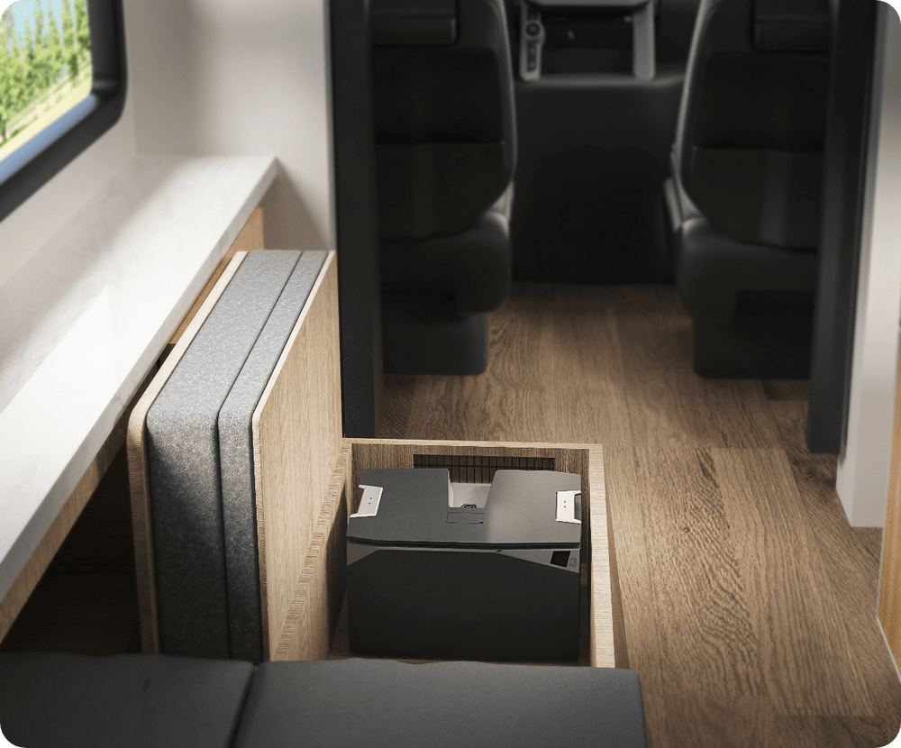 Our compact 2 or 5kWh batteries stack to save space. At 20% lighter and smaller than the industry average, our LFP batteries snugly fit under RV seats or other tight spaces. Easily connect in parallel to use with your third-party 48V system.