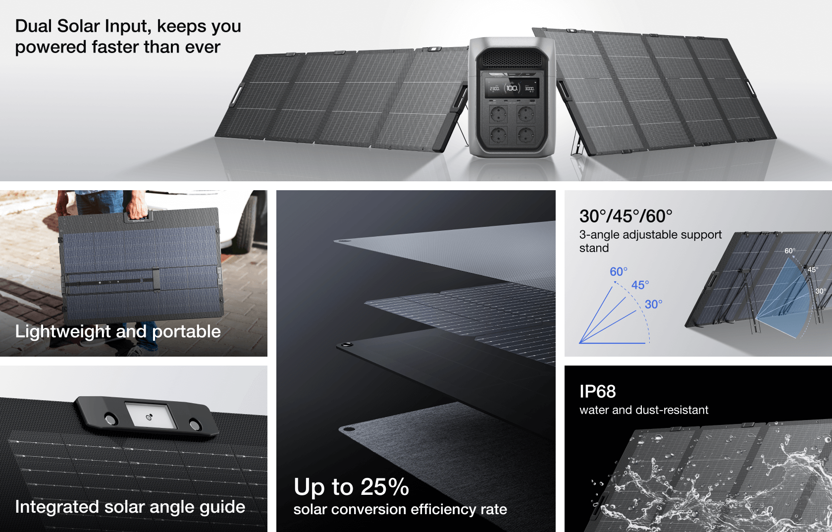With an IP68 water-resistance rating, our 400W Lightweight Portable Solar Panel maintains its high performance even when it's in contact with water. You can safely recharge by the sea or take it out on your boat.