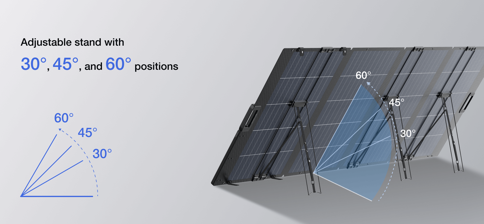 The folding integrated bracket offers a convenient and compact design. Adjustable to 30°, 45°, and 60°, making it ideal for most high-latitude areas. Adjustable stand with 30°, 45°, and 60° positions