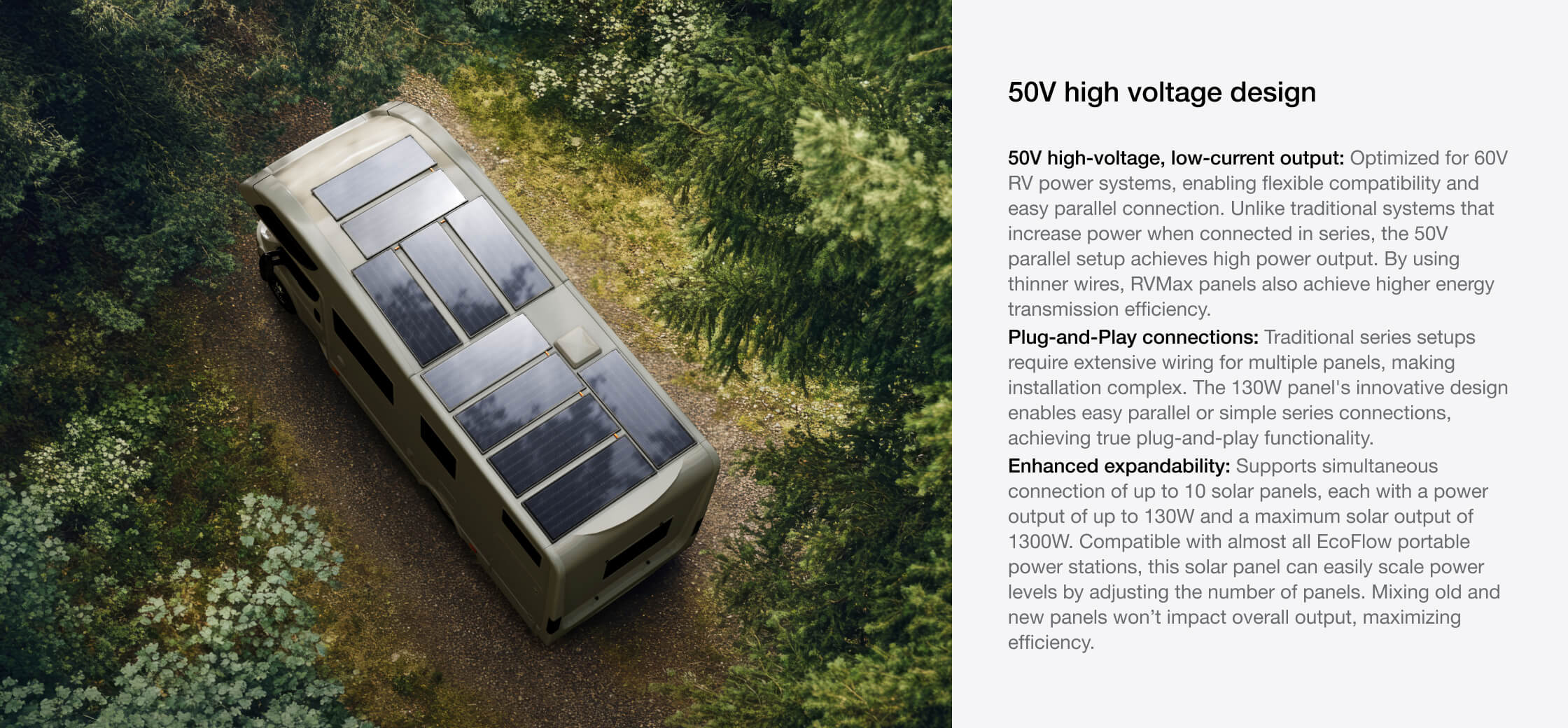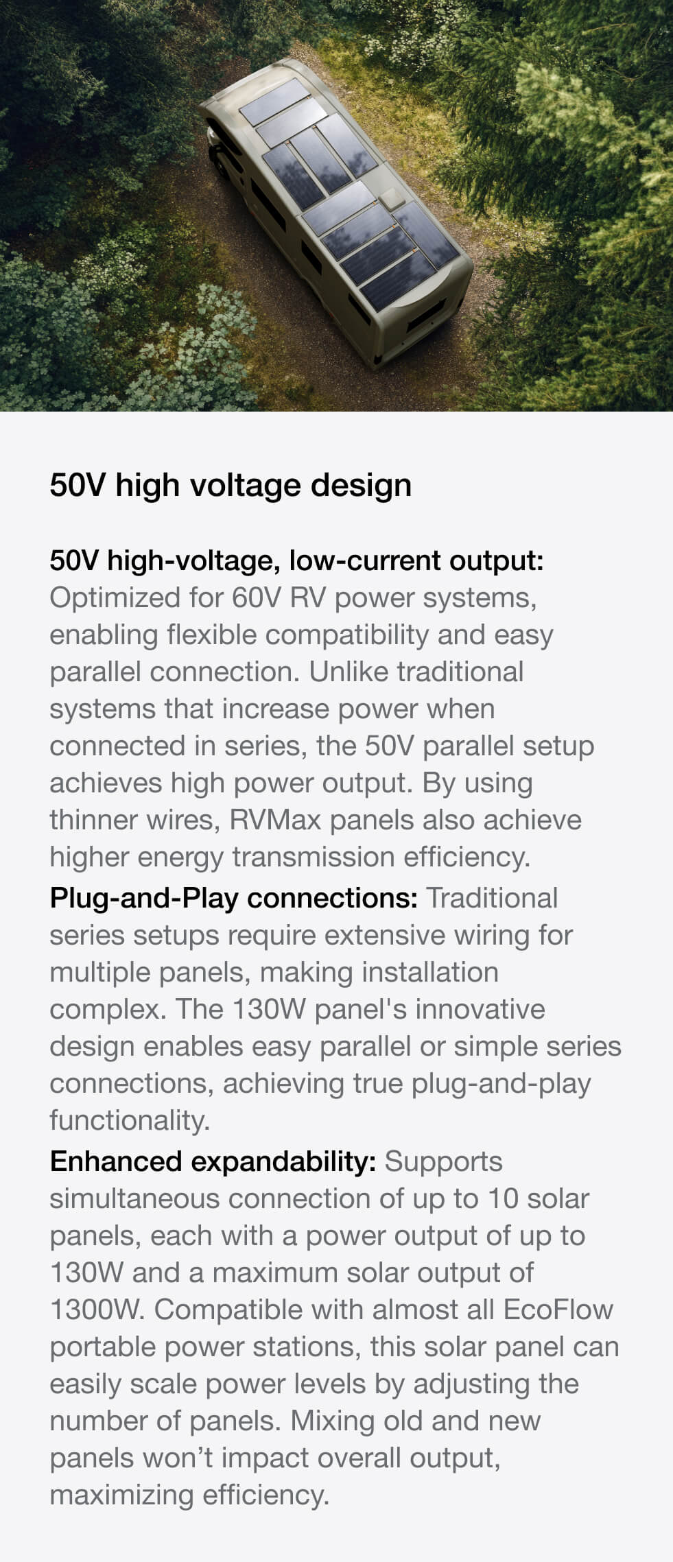 EcoFlow 130W RVMax Rigid Solar Panel features an innovative modular design, delivering up to 130W power, 50V, and 3A current output, and connects up to 10 panels within a safe range. Works seamlessly with various power stations.