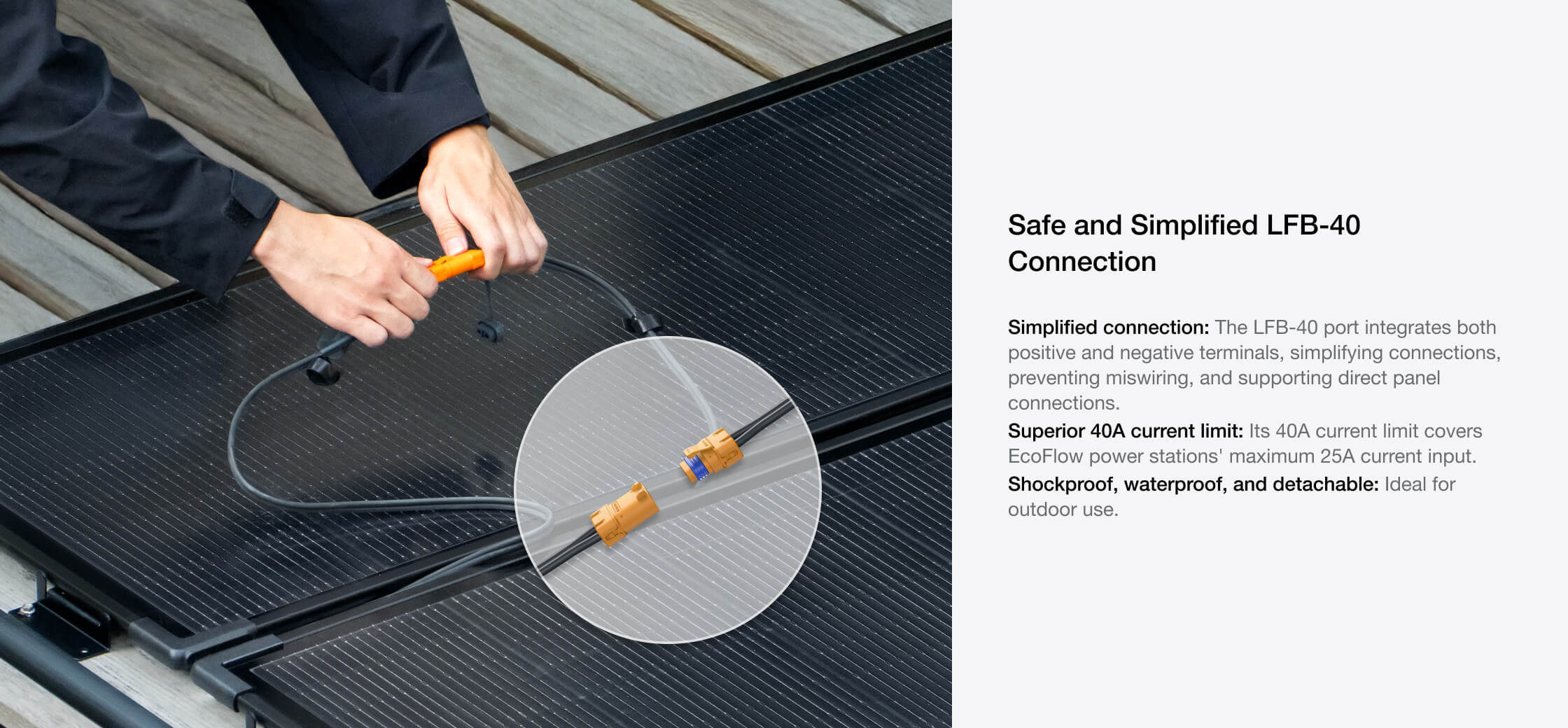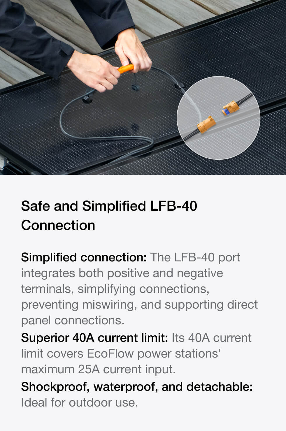 Easily connect to third-party solar systems using the includedphotovoltaic connector (MC4 compatible)⁴. Safely charge yourpower systems and portable power stations with XT60 connectors, featuring waterproof, anti-leak technology that's touch-safe and reliable.