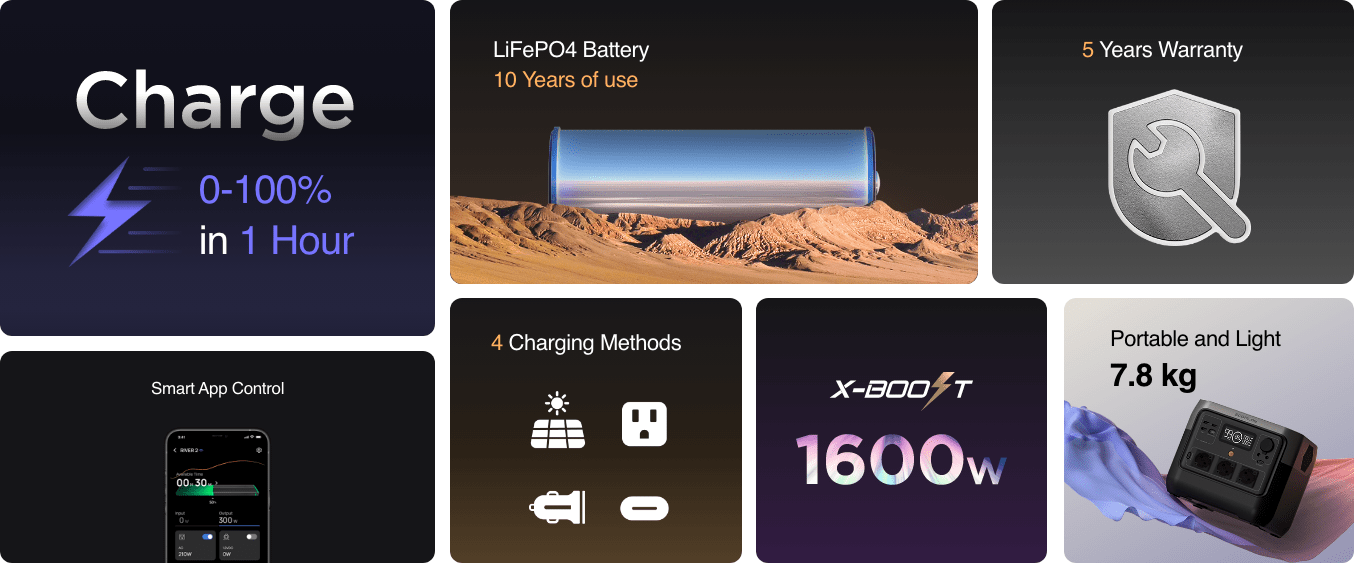 With 4 different ways to top up the RIVER 2 Series, there’s a recharge option no matter what. From fast AC to in-car charging when you’re on the go.