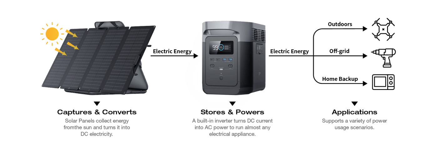 After collecting and storing DC (direct current) energy, the solar generator converts DC into AC (alternating current) electricity that can power appliances both indoors and out.